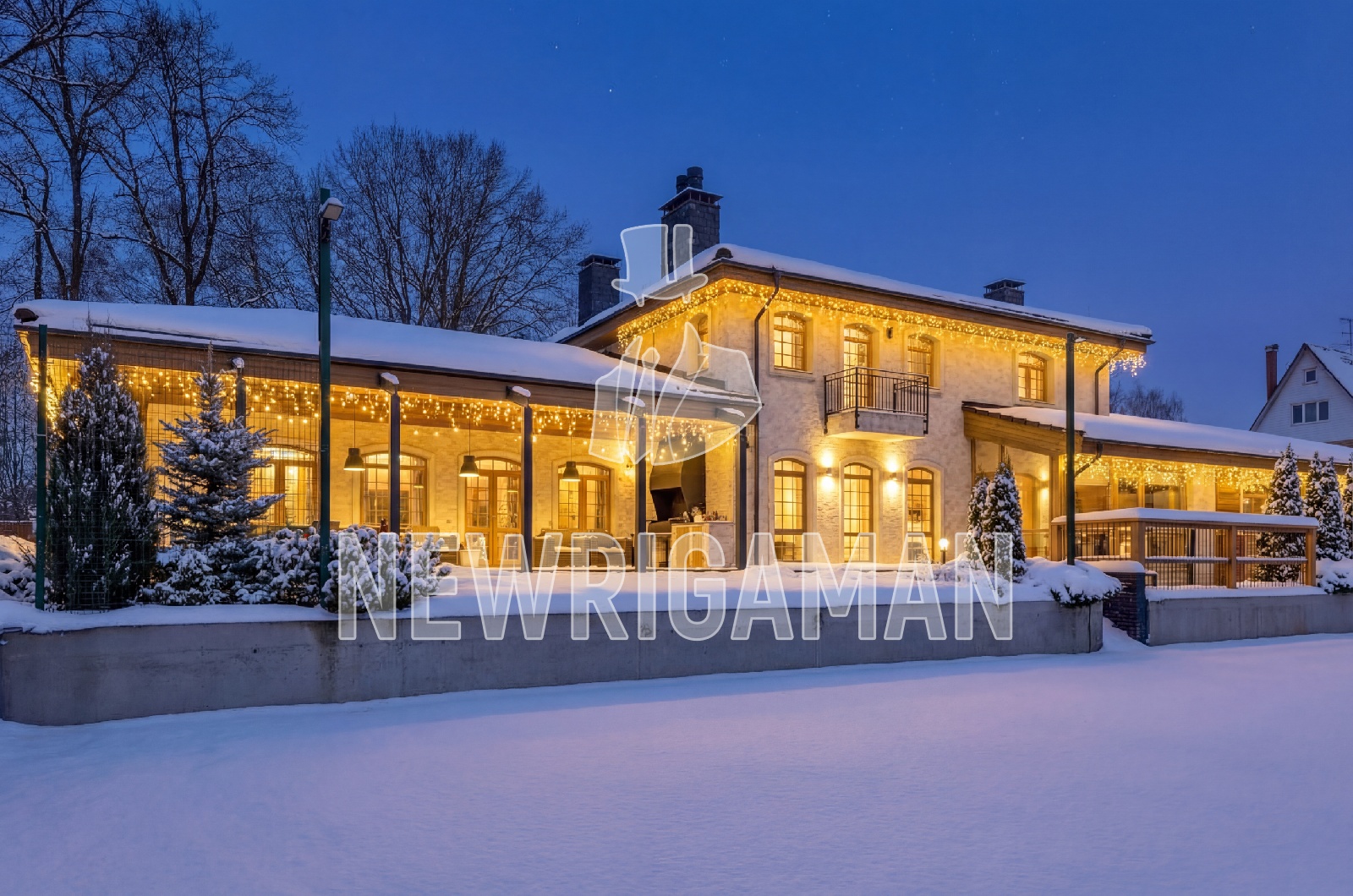 1 этаж - холл, гостиная, кухня, столовая с камином, санузел с душевой, постирочная и терраса, гостевой блок: 2 спальни, с/у,