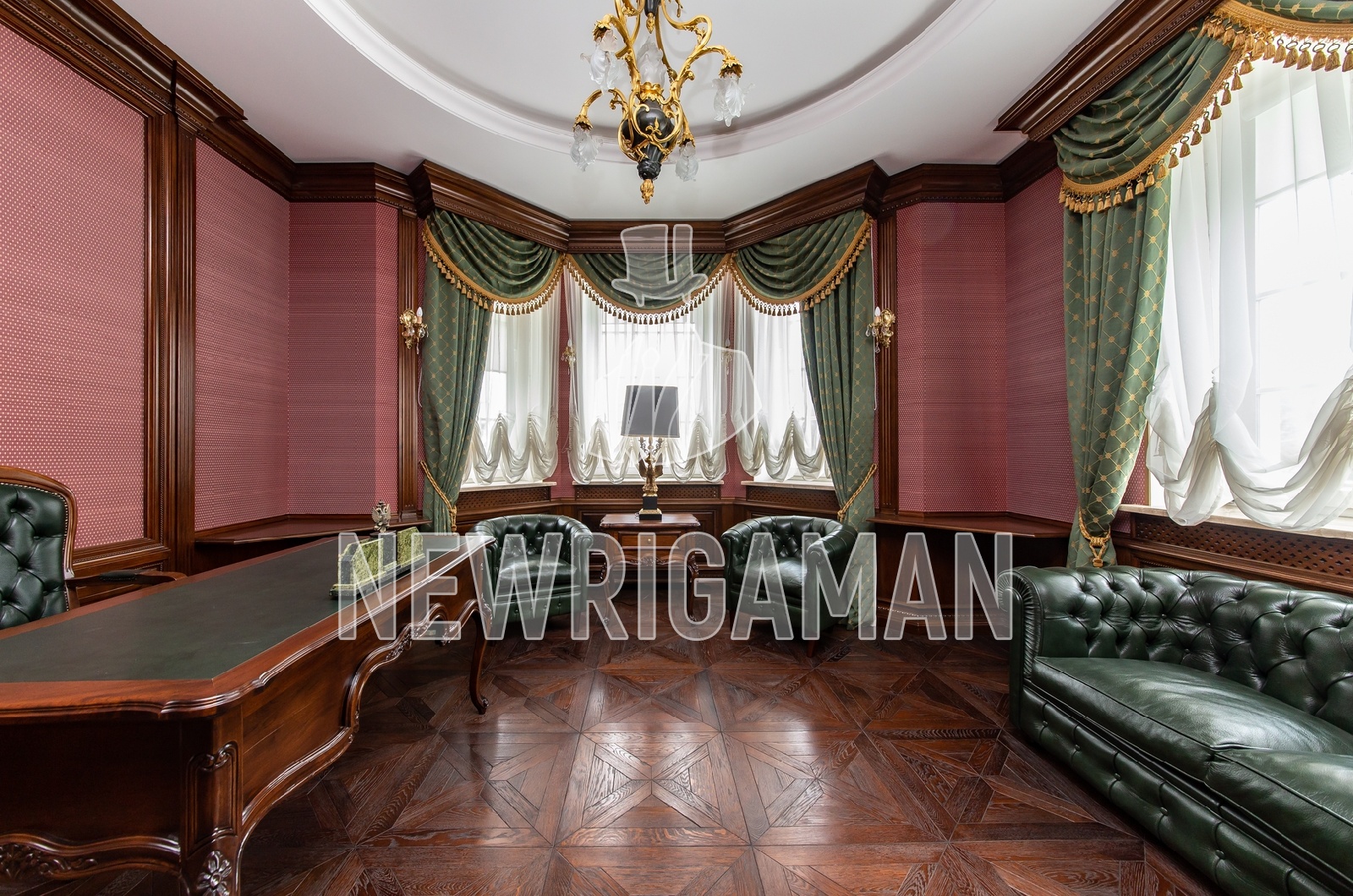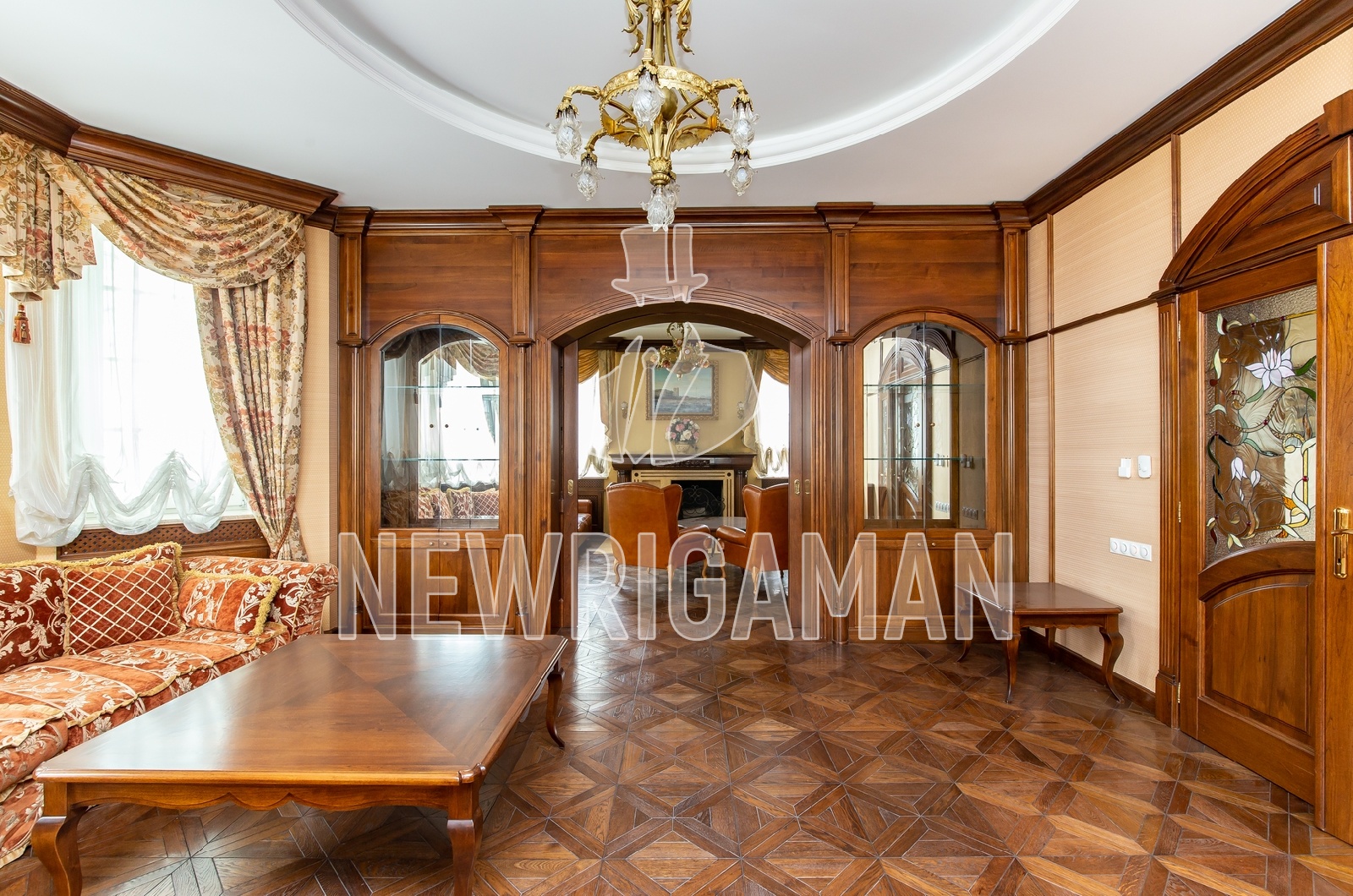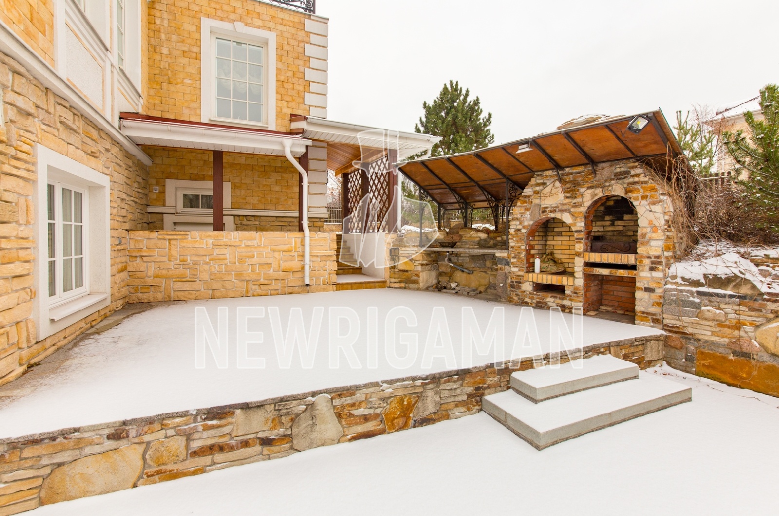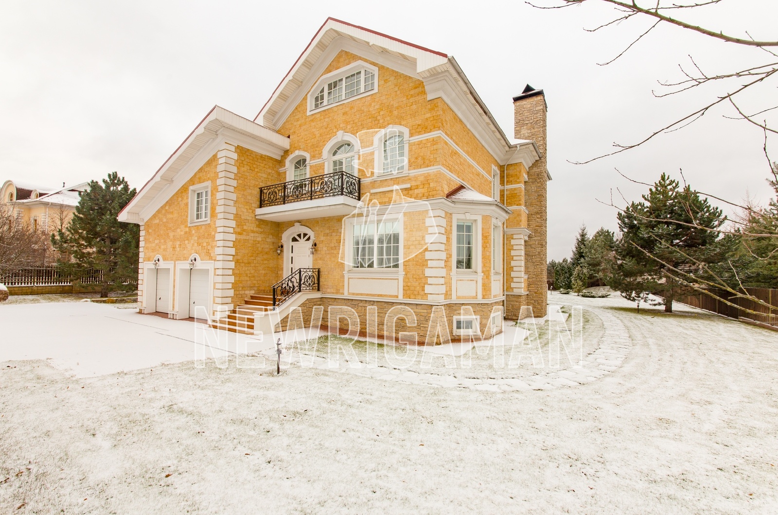 1 этаж - кухня, столовая, гоcтиная, каминная, большая застекленная терраса, с/у,гараж на 2 м/м (над гаражем отдельный блок для персонала)