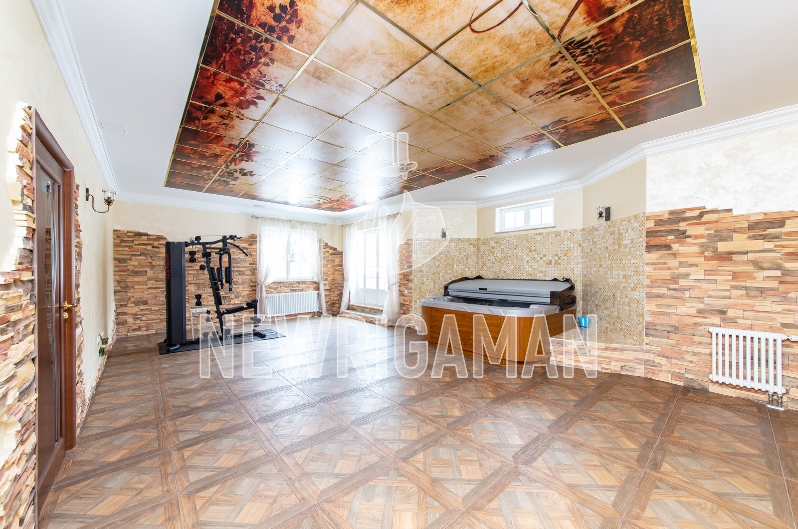 Цокольный этаж - cпортивный зал, сауна, с/у, большая ванна-джакузи, зона отдыха.